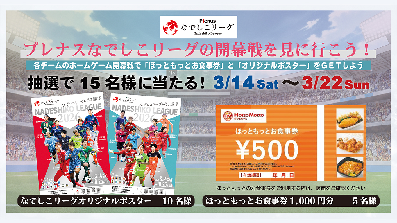 なでしこリーグオリジナルポスターが10名、ほっともっとお食事券(1,000円分)が5名様に当選!